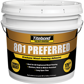 Titebond 801 Preferred Urethane Wood Flooring Adhesive is ideal for the installation of all wood parquet, engineered, solid plank flooring and cork underlayments. It is a moisture-resistant adhesive that provides the installer with the option of using the “wet lay” or “flash” method of installation. This adhesive is preferred over o...
